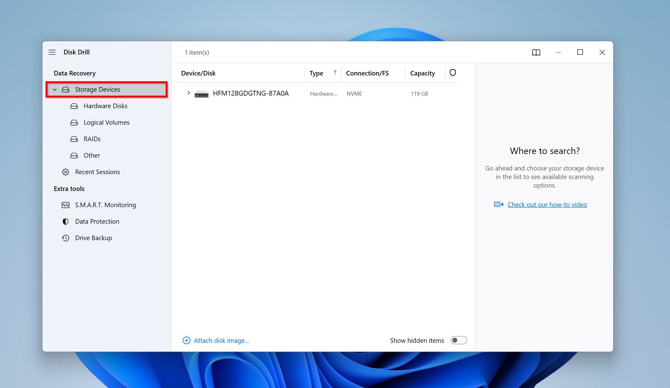 - 打开 Disk Drill 并确保您位于存储设备屏幕。