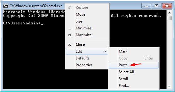 - 要将其粘贴到命令提示符中的任意位置,请找到要粘贴的行,然后再次按鼠标右键。当然,您也可以通过右键单击标题栏然后选择粘贴文本编辑->粘贴。