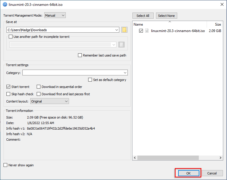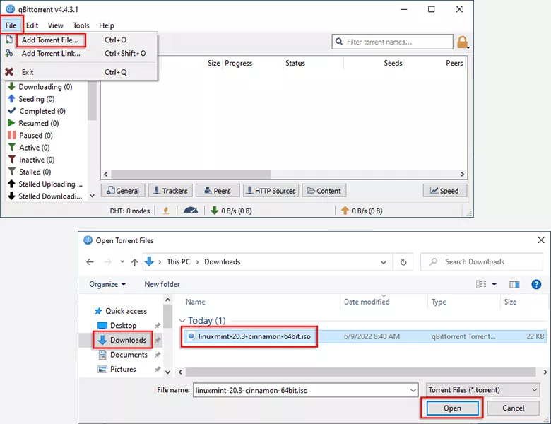 步骤3:启动 qBittorrent,然后单击文件并选择添加种子文件。在弹出窗口中,找到下载的 Linux Mint ISO,然后选择它并单击打开。