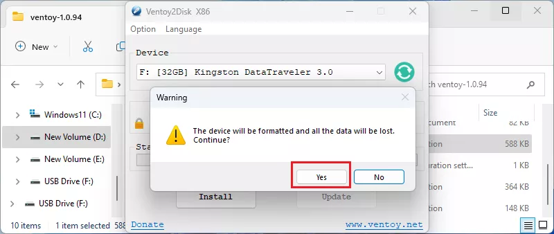 第7步:提示USB设备上的所有数据将被删除,点击好的继续。