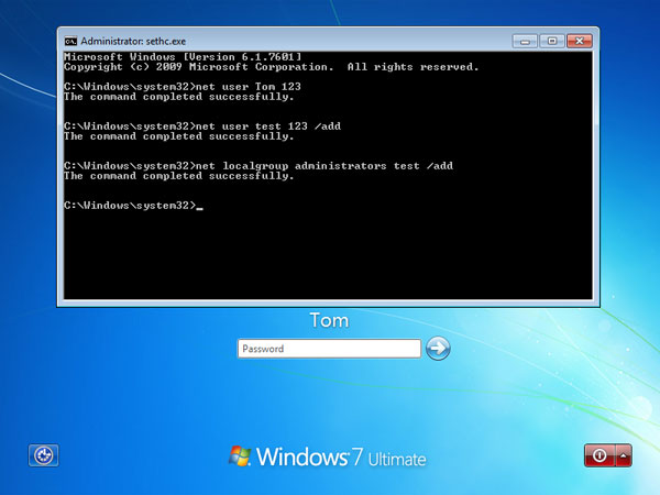 将 Tom 替换为您的 Windows 帐户名称,并将 123 替换为您所需的密码。 - 要创建新的用户帐户并将其添加到管理员组,请一一运行以下命令: