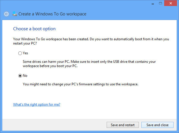 - 一旦制作了USB驱动器的窗口,您可以选择是否设置主机PC从USB设备启动,还是将其视为原样。您可以通过选择否,然后选择保存和关闭来关闭此向导。