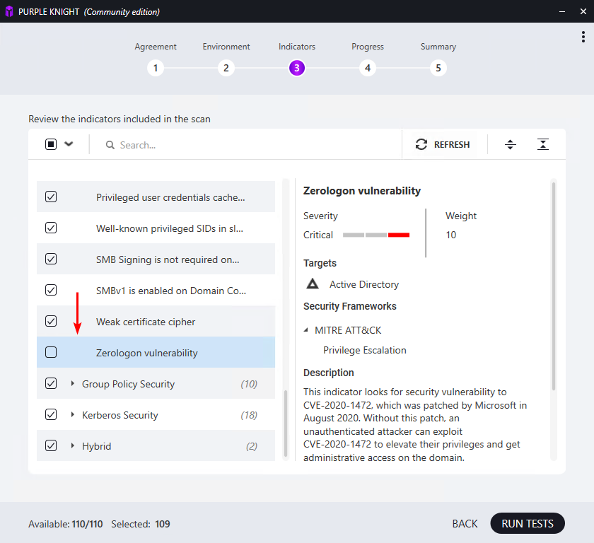 笔记:默认情况下,只有一个复选框被取消选中,那就是零登录漏洞安全指标。这是因为在典型的生产环境中执行需要几个小时。在取消选择的情况下运行报告,一旦您能够完成报告,返回并启用 Zerologon 漏洞以进行新的扫描。