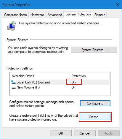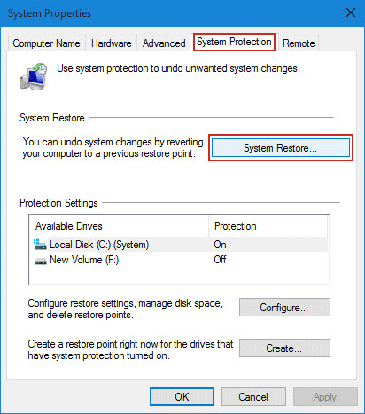 步骤3:之后系统属性对话框打开,使系统保护已选择选项卡。在“保护设置”部分下,选择要为其创建还原点的驱动器(系统驱动器或任何其他卷),然后单击配置。