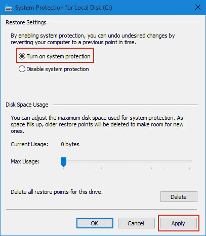 第4步:选择选项“开启系统保护“,然后单击申请,然后单击好的。这将打开驱动器的系统保护。