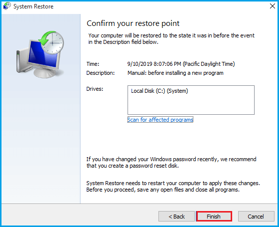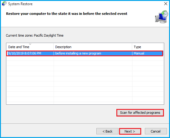 步骤 3.选择一个还原点,点击扫描受影响的程序查看如果使用此还原点将不会安装哪些程序,然后将其关闭。之后,单击下一个按钮。