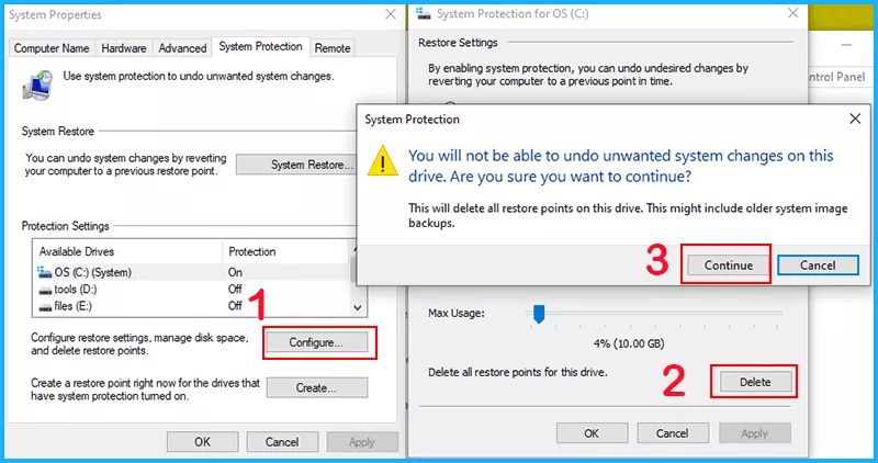 第4步:击中删除按钮并确认。之后,该驱动器上的所有还原点都将被删除。