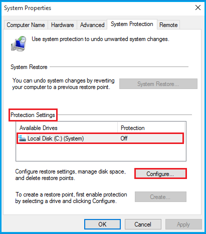 步骤 3.下保护设置,单击您的系统驱动器(通常是 C),然后单击配置。