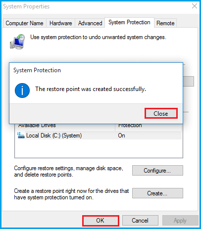 步骤 4。还原点创建成功后,点击关闭按钮,然后单击好的按钮。