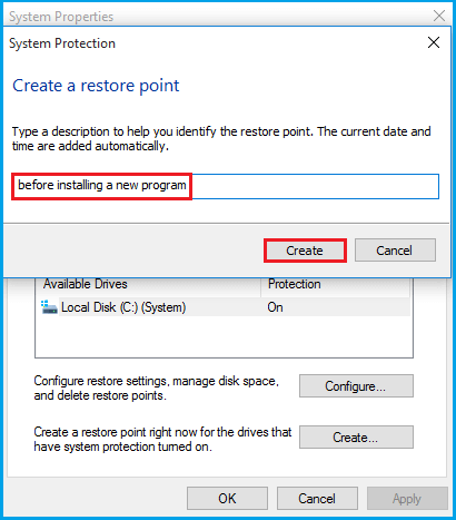 步骤 3.自行为还原点输入一个描述性名称以帮助您识别它,然后单击创造。