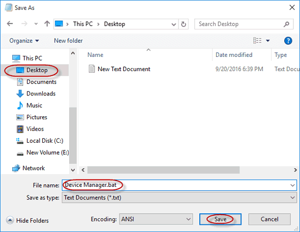 第 4 步:何时另存为弹出窗口,选择桌面>设备管理器.bat>节省依次菜单。这设备管理器快捷方式将立即显示在 Windows 10 桌面上。