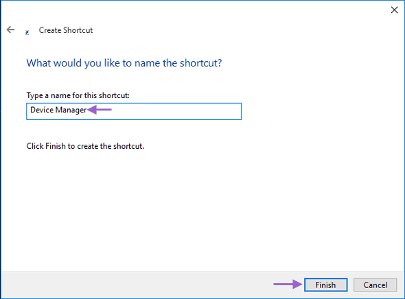 第 4 步:开始输入装置经理在名称框中,然后单击结束立即到创建设备管理器的快捷方式在 Windows 桌面上。