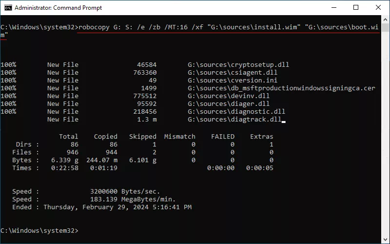 步骤1:类型robocopy G: S: /e /zb /MT:16 /xf "G:sourcesinstall.wim" "G:sourcesboot.wim"。