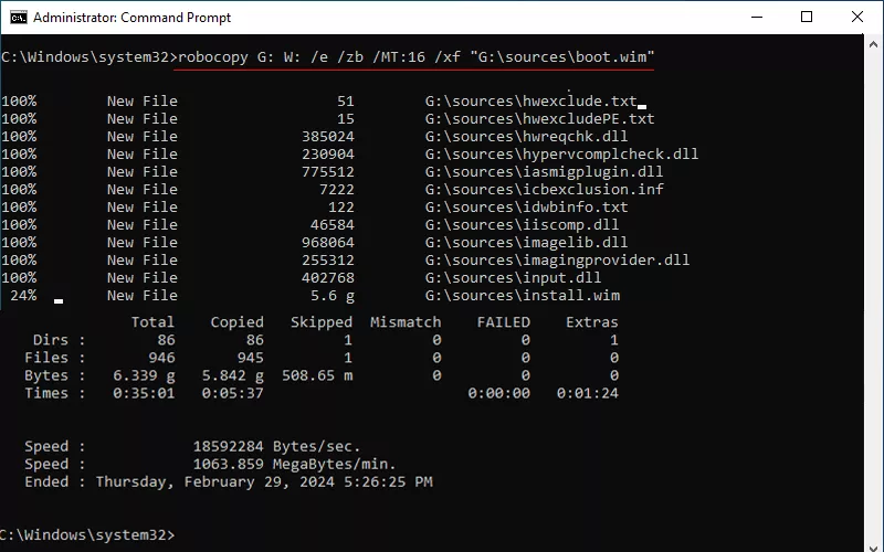 步骤4:类型robocopy G: W: /e /zb /MT:16 /xf "G:sourcesboot.wim"。