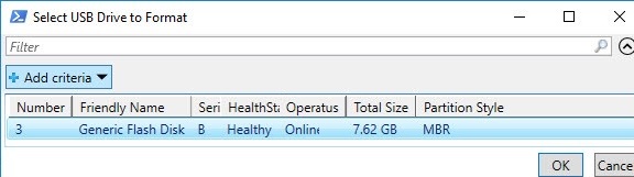 $Results = Get-Disk |Where-Object BusType -eq USB |Out-GridView -Title 'Select USB Drive to Create UEFI bootable device' -OutputMode Single |Clear-Disk -RemoveData -RemoveOEM -Confirm:$false -PassThru |New-Partition -UseMaximumSize -IsActive -AssignDriveLetter |Format-Volume -FileSystem FAT32