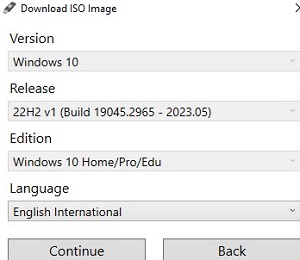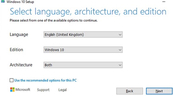 - 选择要写入USB驱动器的Windows 10图像的语言,版本和架构(x86,x64或两者);