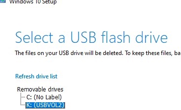 选择要燃烧Windows 10 Enterprise安装图像的USB驱动器。