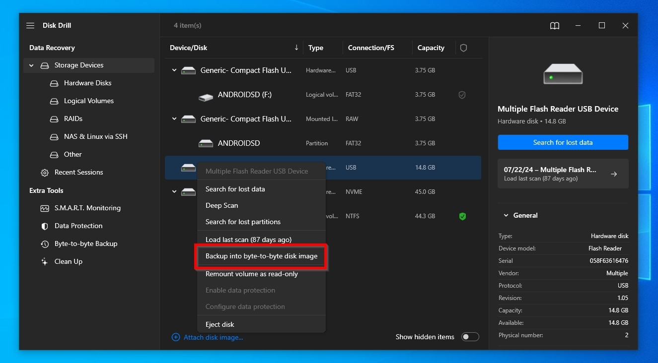 要使用 Disk Drill 将整个磁盘克隆到备份映像中,并确保即使磁盘出现故障,您的数据也可用:
