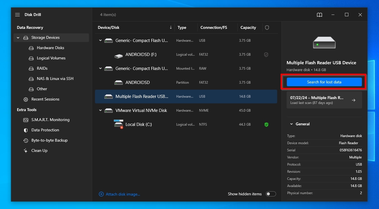 尽管显示“设备未就绪”错误,但某些第三方应用程序是否可以访问您的磁盘?在另一台电脑上运行是否没有问题?采取主动行动确保文件安全:获取完整备份并尽快复制文件。您可以使用专门的应用程序来完成这些任务。不过我还是会用盘钻对于本文来说,它内置了对原始字节到字节备份的支持以及出色的数据搜索和恢复引擎。