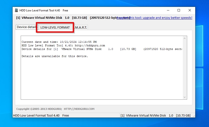 - 该工具的窗口将发生变化,显示有关所选驱动器的详细信息。移至低级格式化选项卡。