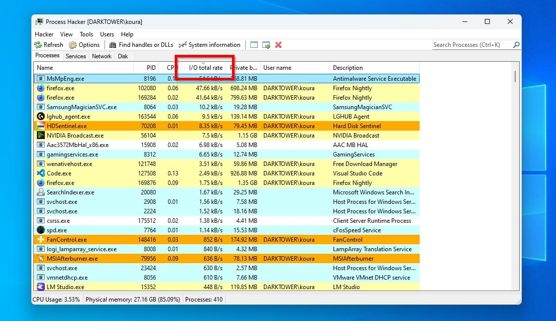 - 如果应用程序的 I/O 总速率仍然很高,其详细信息似乎很可疑,并且在您给它五分钟后继续运行,请尝试强制终止它:在 Process Hacker 的主窗口中,右键单击在应用程序的条目上并选择终止,或左键单击它并点击删除在你的键盘上。