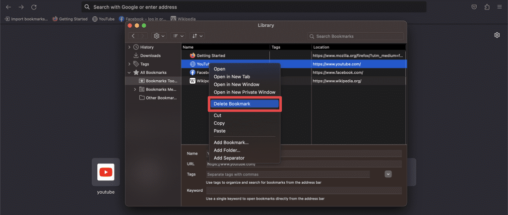 - 将出现一个新窗口,显示您的所有书签。右键单击要删除的书签并选择删除。