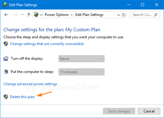 - 要删除自定义电源计划,您首先必须选择另一个电源计划作为活动计划。然后点击链接“更改计划设置” 在您要删除的自定义电源计划旁边。