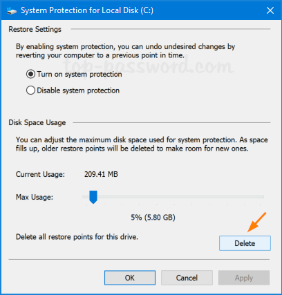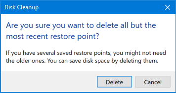 当磁盘清理确认框打开时,单击删除Windows 10 将删除所有还原点,同时保留最新的还原点。