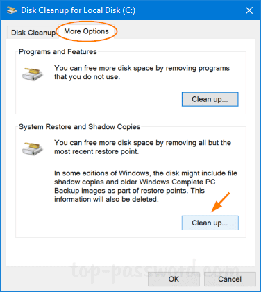 前往更多选择选项卡,单击清理“系统还原和卷影副本”部分下的按钮。