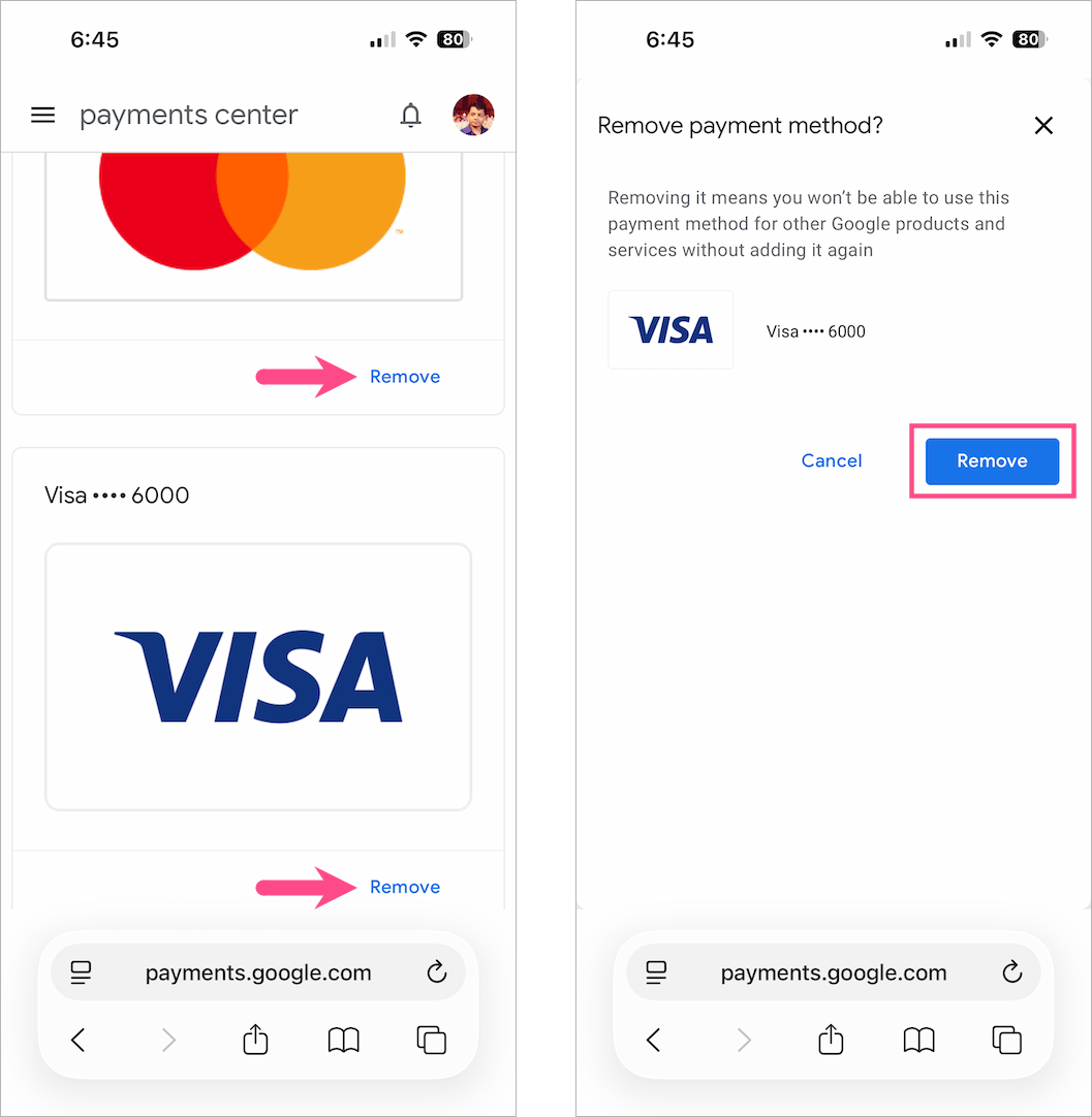 - 找到您要删除的付款方式并点击消除在它旁边。
