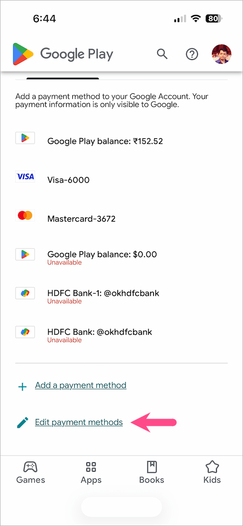 - 点按您的个人资料图标并前往付款和订阅>付款方式。
