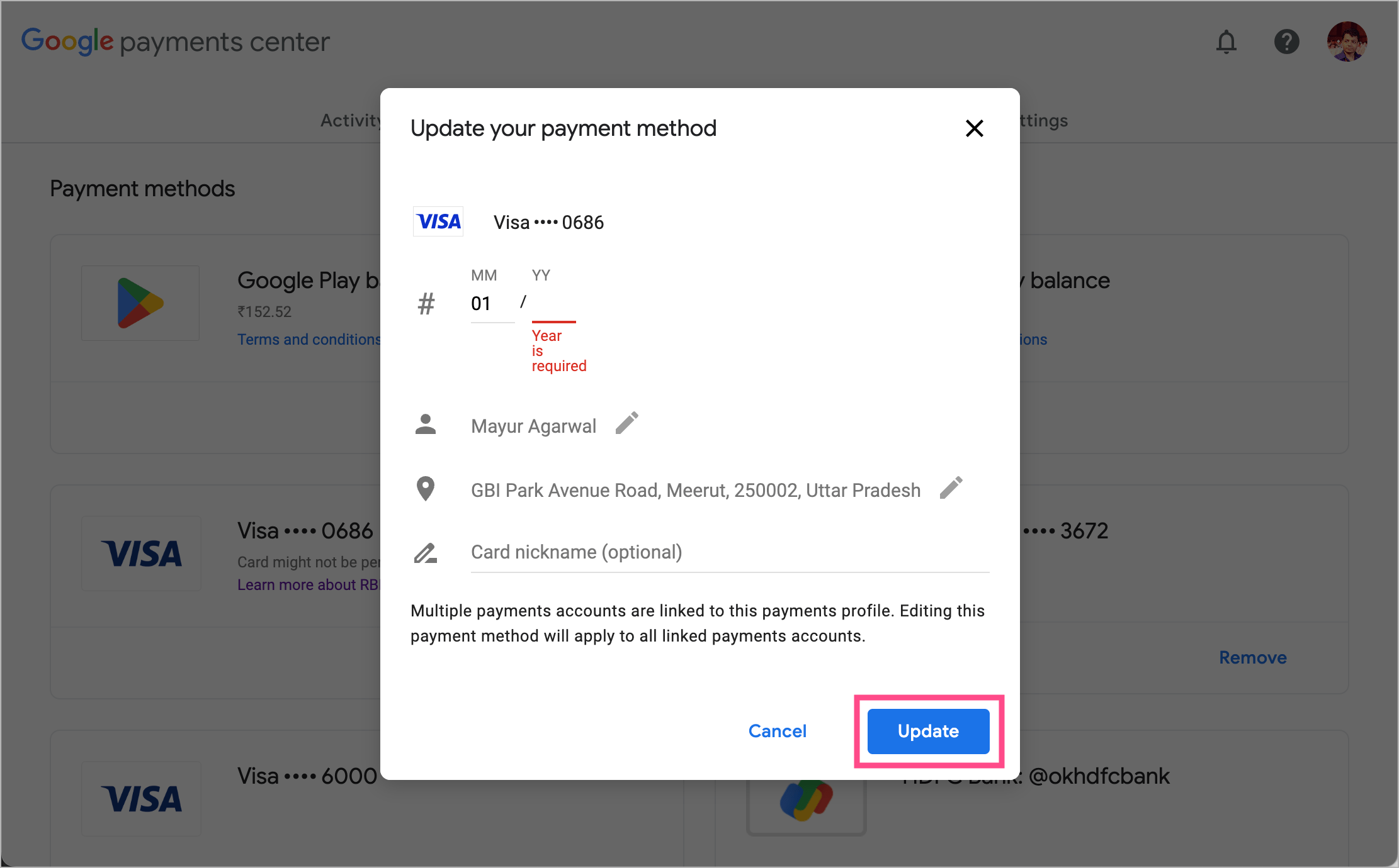 您还可以更新现有的卡或账单信息,而不是删除付款方式。