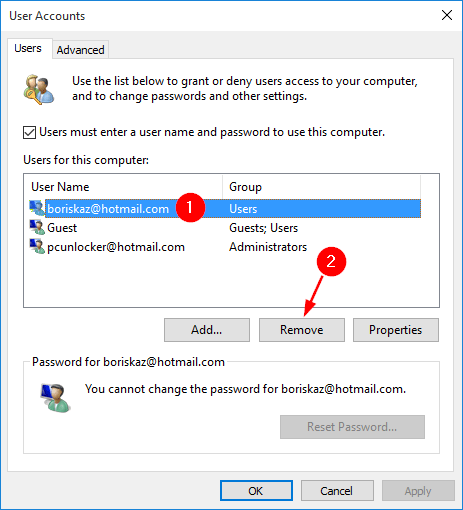 - 选择您要删除的儿童帐户,然后单击消除。如果“删除”按钮呈灰色且禁用,您需要检查“用户必须输入用户名和密码才能使用这台计算机”选项首先。