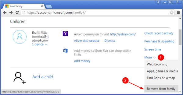 - 下孩子们部分,找到您要删除的儿童帐户,然后单击更多的进而从家庭中删除。