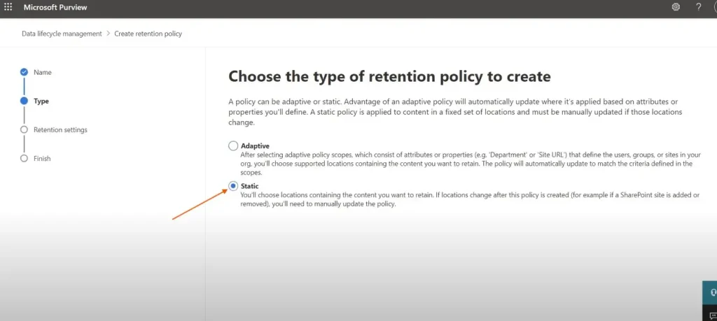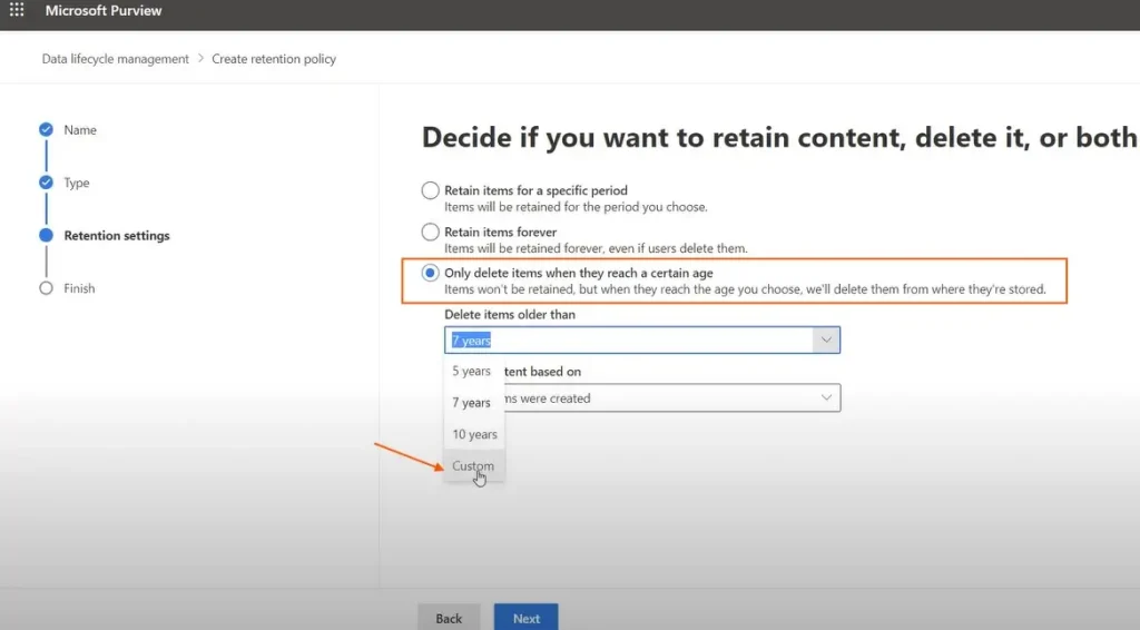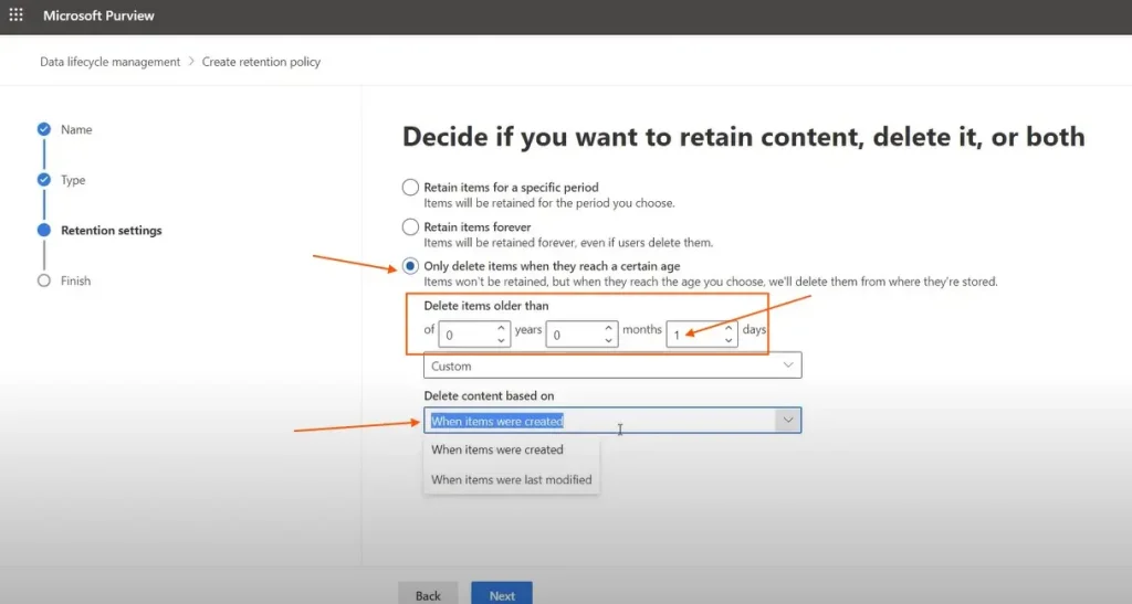现在您可以选择选择保留政策的类型