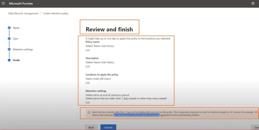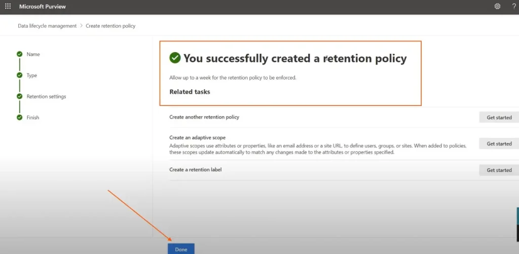 单击后提交它会看到屏幕说:“您成功制定了保留政策”。