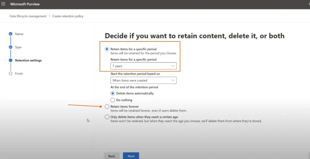 默认情况下,您将看到7年的保留时间,以及如下图所示的永远保留项目的选项。