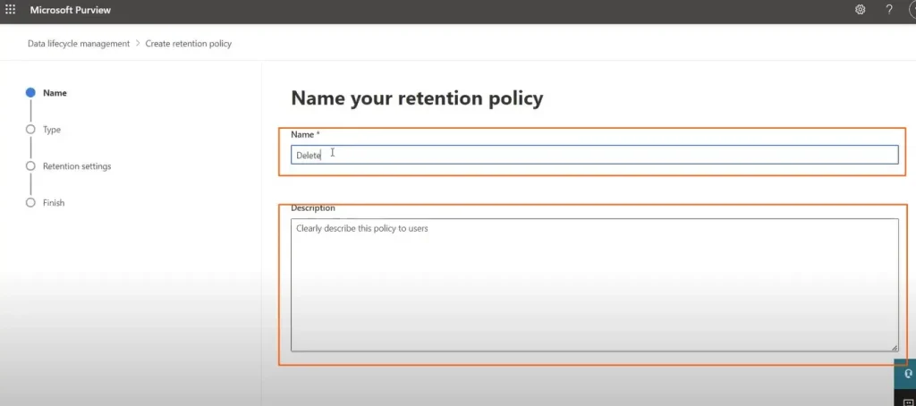 命名您的保留政策并提供描述,然后单击下一个