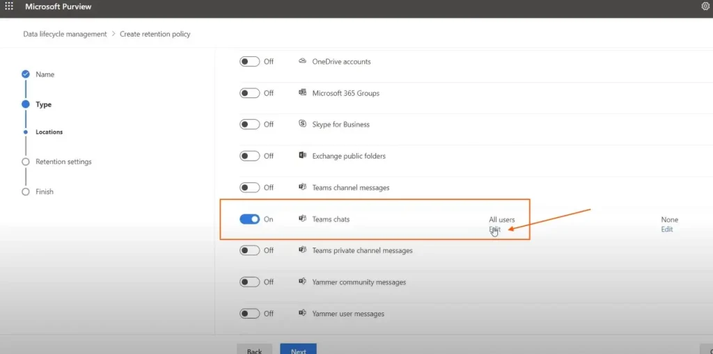 因此,在这里,我们将选择团队聊天,您也可以选择团队频道消息,甚至您也可以选择以包含并排除策略的用户,然后继续下一步。