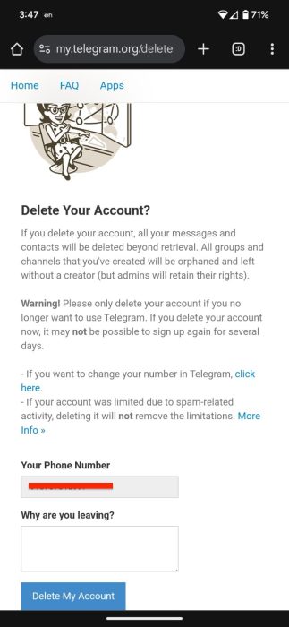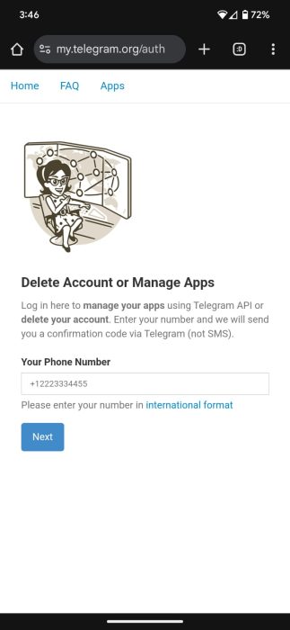与iOS不同如果不在Android上的功能不允许用户立即删除其帐户。相反,Android用户还必须依靠Telegram的帐户删除页面。这是如何做的: