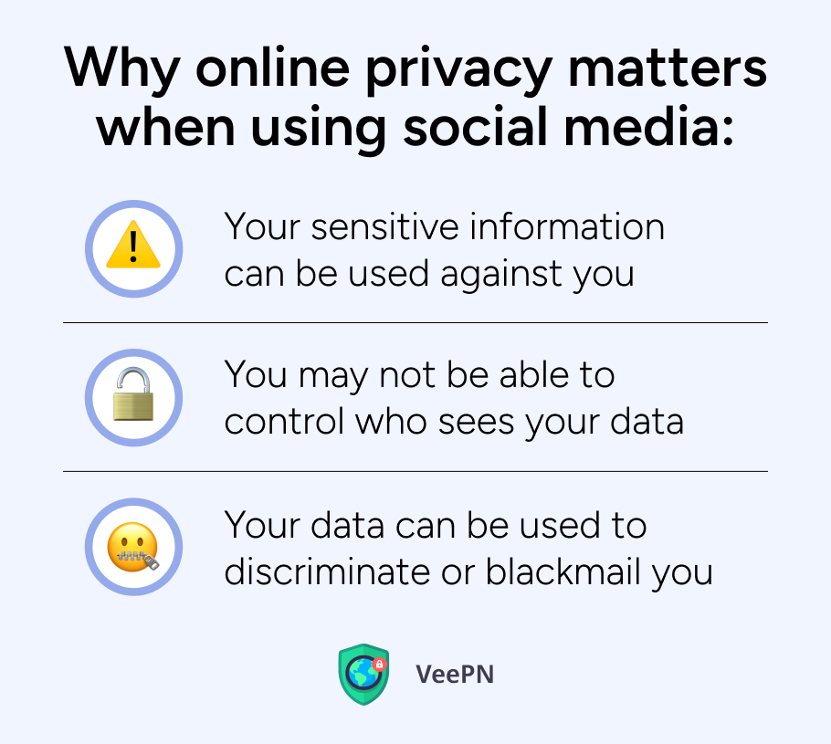 - 您的敏感信息可用于您。当您冲浪社交媒体网站时,互联网窥探者和数字代理商会收集有关您的许多详细信息,例如您的个人信息,您的地理位置,首选兴趣,甚至您的政治观点。企业以及网络犯罪分子可以利用这些数据分发个性化广告或创建整个网络钓鱼攻击活动。