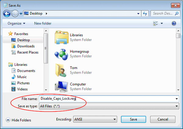 - 单击文件菜单并选择另存为。选择 ”所有文件” 从“另存为类型”下拉框。输入文件名为Disable_Caps_Lock.reg。单击节省。