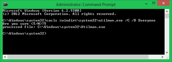 输入以下命令并按 Enter 键。这将修改 utilman.exe 文件上的 ACL,因此每个人都没有执行该程序的权限。
