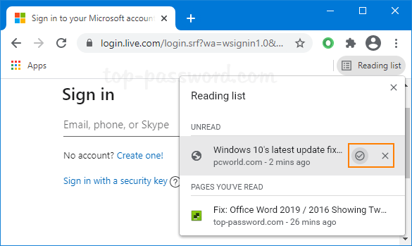 当您将光标移到阅读列表菜单中显示的网页上时,它将在右侧显示两个图标。您可以单击圆圈图标手动将网页标记为已读(或未读),或单击“X' 图标将其从列表中删除。