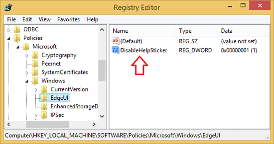 重新启动电脑,帮助贴纸通知将在 Windows 8.1 中消失。不过,如果您觉得需要找回它,可以通过导航回 EdgeUI 项并将其从注册表中删除来实现。这将再次启用帮助标签。