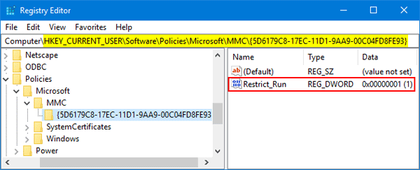 HKEY_CURRENT_USER\Software\Policies\Microsoft\MMC\{5D6179C8-17EC-11D1-9AA9-00C04FD8FE93}如果最后两个密钥(MMC、{5D6179C8-17EC-11D1-9AA9-00C04FD8FE93})不存在,则需要手动创建它们。