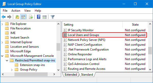 User Configuration -> Administrative Templates -> Windows Components -> Microsoft Management Console -> Restricted/Permitted snap-ins - 现在,在右侧窗口中,双击“本地用户和组”设置进行修改。