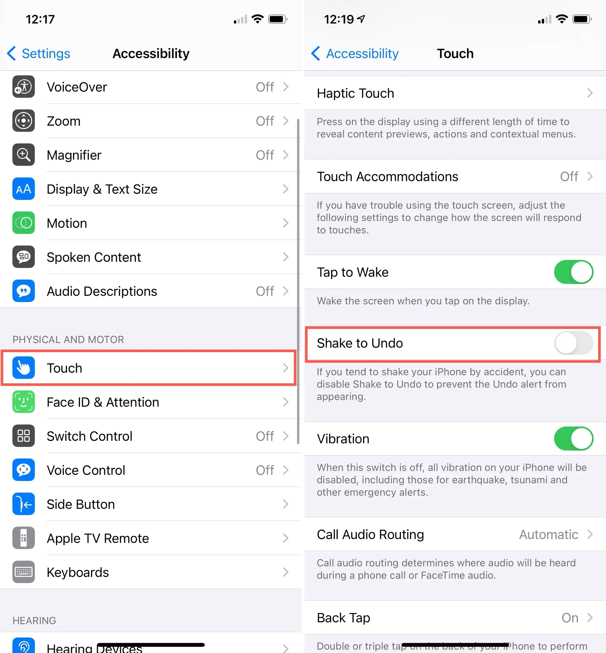 切断每个应用程序的震动检测的一种快速方法是关闭全局“震动至撤消”快捷方式。大多数广告 SDK 都依赖此开关,因此一旦禁用,您的 iPhone 就会忽略休闲广告
