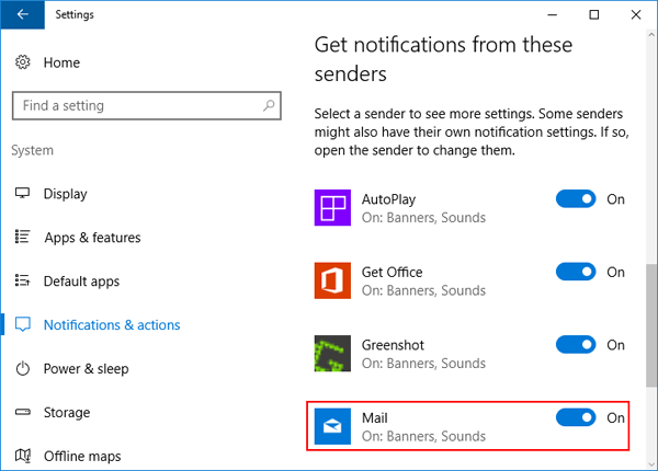 - 在窗口左侧,单击通知和操作。然后,在右侧向下滚动到“获取来自这些发件人的通知”部分,然后单击您想要阻止播放通知声音的应用程序。