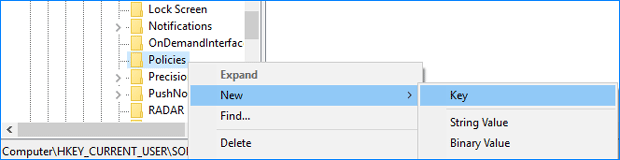 步骤 2:当注册表编辑器窗口打开时,导航至HKEY_CURRENT_USERSoftwarePoliciesMicrosoftWindows。右键单击视窗文件夹,然后选择新的->钥匙创建一个新密钥。然后重命名它我相信。